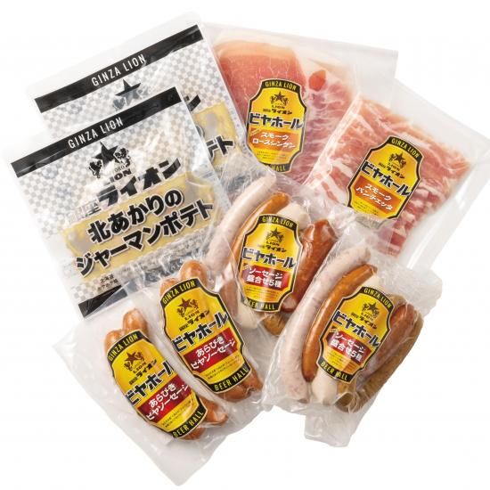 ソーセージ盛合せ5種(225g)×2パック、あらびきビヤソーセージ2本(100g)×2パック、スモークロースシンケン125g×1パック、スモークパンチェッタ125g×1パック、ジャーマンポテト200g×2パック